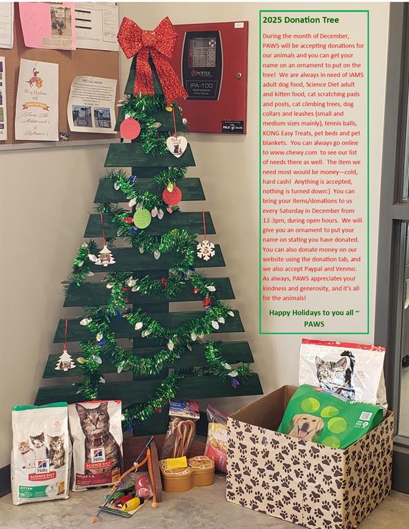 | Our 2025 Donation Tree - come check it out and bring your donation for our wonderful adoptable animals:) *********************************************************** And more good news - we now have a can collection site at our local Bomgaars - woop woop! It's another way to donate - just save your refundable cans and bottles (no glass please!) and drop them off when your bin at home gets full. HUGE thanks go to Nikki's Nickels and Bomgaars for allowing this to happen! And if you didn't already know this about PAWS, 100% of these proceeds go towards the care and treatment of the dogs and cats at the shelter, so this is a wonderful fund-raising opportunity for us! The bin sits at the north entrance to the store - check it out!!